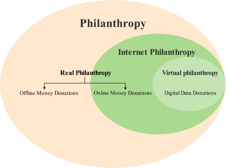 As seen in Figure 1, virtual philanthropy can be treated as a novel type of Internet philanthropy, distinct from real philanthropy (offline and online money donations). It differs from traditional real philanthropy in the nature of the donation, the mechanism of giving, and the scope of beneficiaries.