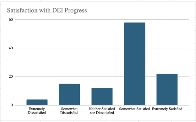 Of our sample (N=111), 79 (71%) reported having a DEI policy. Of those with a policy, 53 (67%) had made a change to that policy in response to social movements. Overwhelmingly, organizations were satisfied with their DEI progress.